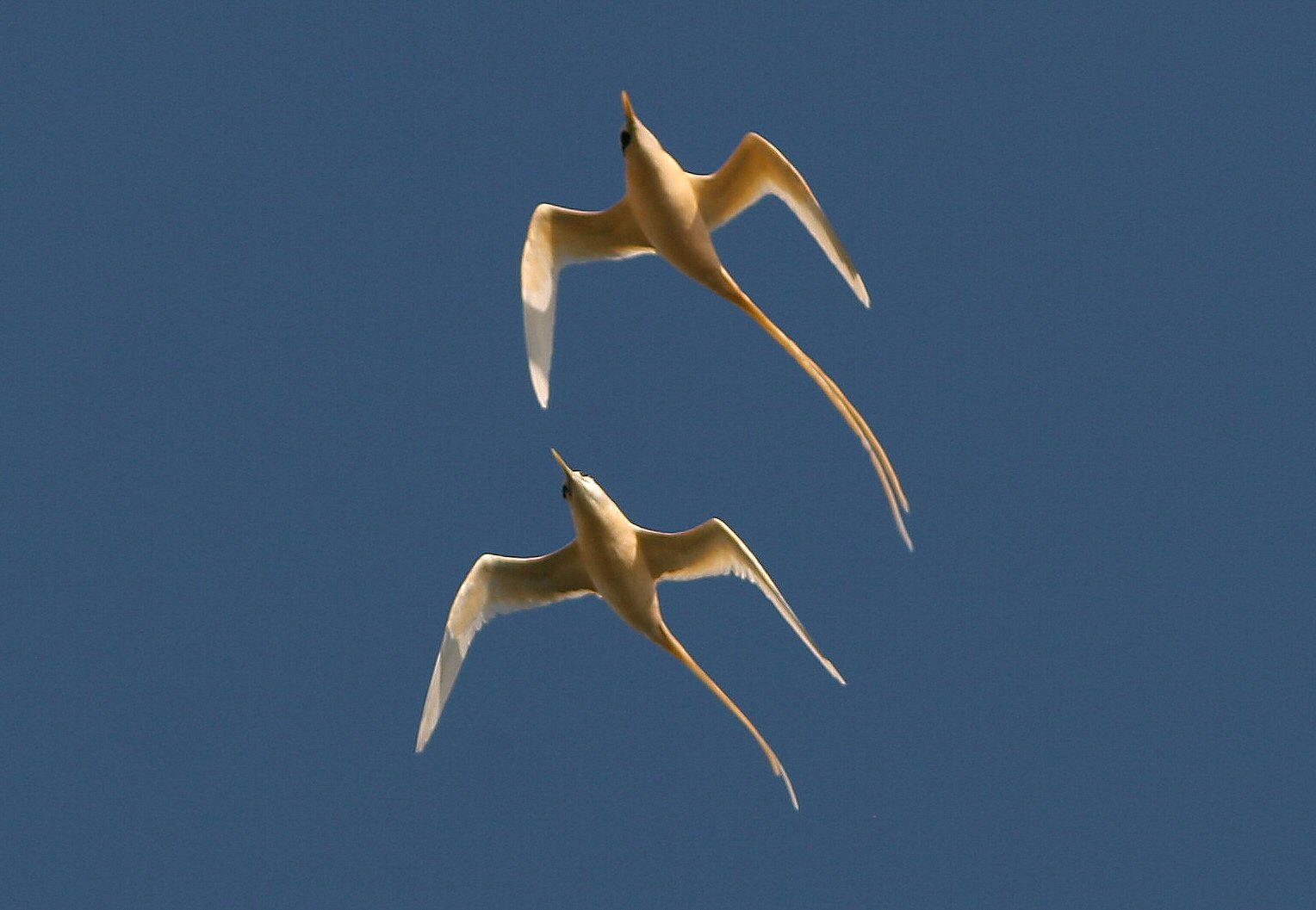 Christmas Island - July 2007 The Golden Bosunbirds are a golden-coloured subspecies of White-tailed Tropicbird that only occur on Christmas Island. This pair was indulging in a mirror display for several minutes. All of the pairs displaying at Flying Fish Cove were golden. The white White-tailed Tropicbird on the island were elsewhere. |